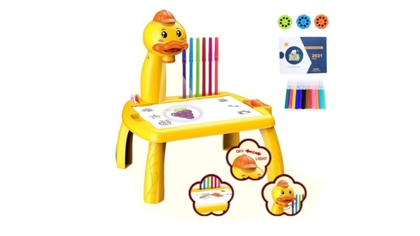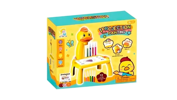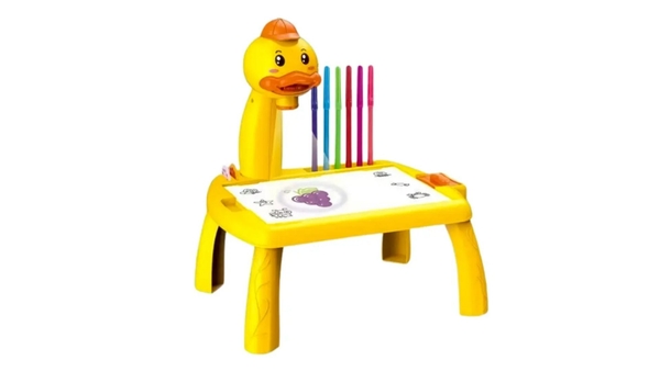 Tính năng: Điểm nổi bật nhất là hệ thống đèn chiếu sáng hình con vịt gắn phía trên bảng. Khi lắp các đĩa phim đi kèm và bật nguồn pin, đèn sẽ chiếu các hình ảnh mẫu xuống mặt bảng. Bé chỉ cần dùng bút vẽ theo các đường nét hiện ra, giúp việc học vẽ trở nên đơn giản và thú vị hơn. Mặt bảng có tính năng xóa sạch dễ dàng, cho phép trẻ thỏa sức sáng tạo nhiều lần mà không cần dùng đến giấy vẽ thông thường.